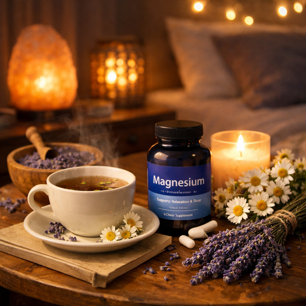 Magnesium plays a key role in nervous system regulation and muscle relaxation. It helps activate the parasympathetic nervous system, which promotes calm and rest. Some people benefit from magnesium glycinate or magnesium citrate taken in the evening.